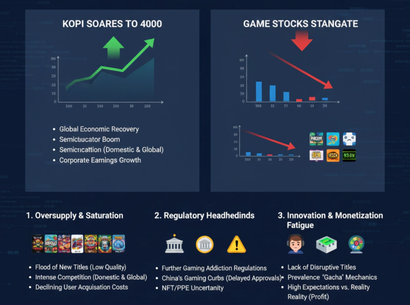 2025년 국내 증시를 대표하는 코스피가 사상 처음으로 4000선을 돌파하며 역대급 랠리를 이어갔음에도 불구하고, 국내 주요 게임 상장기업들의 주가는 오히려 하락하거나 지수 상승을 따라가지 못하는 흐름을 보이고 있습니다. 전반적인 지수 강세와 개별 업종 간의 괴리가 뚜렷해지면서 게임주 투자자들의 관심이 분산되는 모습입니다. 코리아중앙일보+1