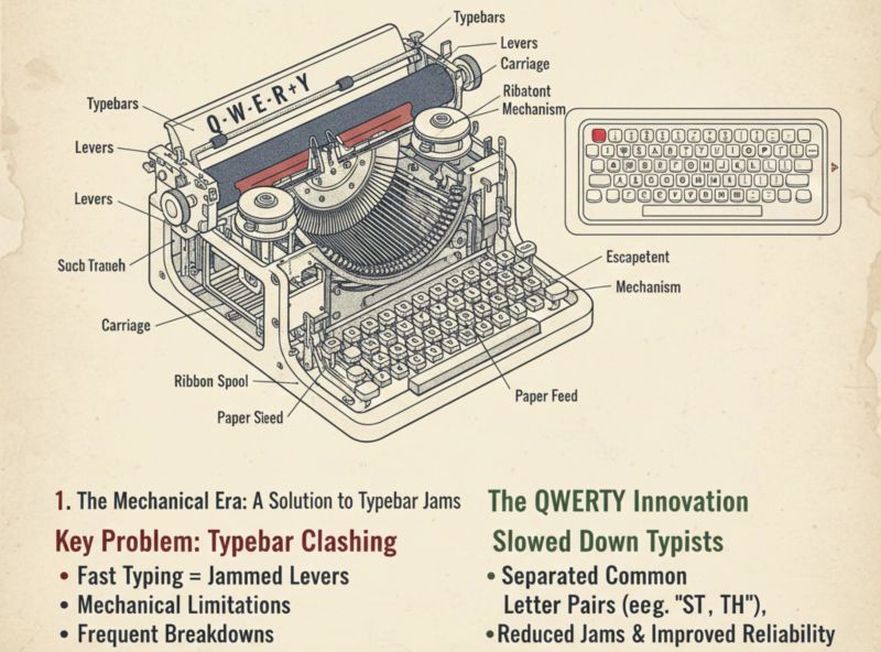 초기의 타자기는 타이핑 속도가 빨라질수록 기계 팔(타이프 바)이 서로 엉키는 문제가 있었습니다.