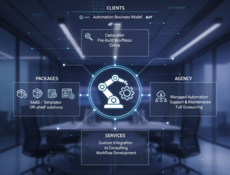 자동화를 패키지·서비스·대행 형태로 제공하는 B2B 수익 구조를 보여주는 이미지
