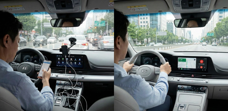 - 무선 연결: 최신 차량(2024년 이후 모델 등)은 대부분 무선 연결을 지원합니다. 차에 타서 시동만 걸면 5초 안에 내비가 뜹니다.
