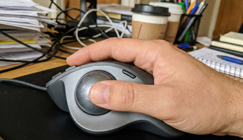 마우스 본체는 가만히 두고, 엄지손가락으로 볼을 굴려서 커서를 움직이는 방식입니다. 처음엔 어색하지만, 익숙해지면 다른 마우스는 못 씁니다.