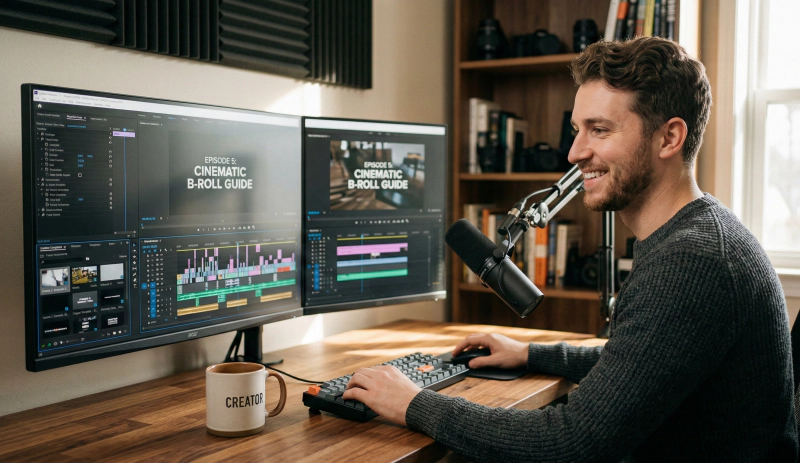 무료 영상 소스와 효과음, 템플릿을 활용하여 풍성하고 전문가다운 유튜브 영상을 편집하는 크리에이터의 모습