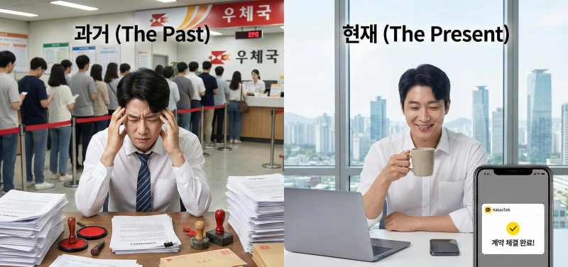 프린터도 없는데 PC방 가서 출력하고, 인주 찾아서 도장 찍고, 우체국 가서 등기 부치고... 이 과정만 하루가 다 갑니다. 심지어 지방에 있는 클라이언트와 계약하려고 KTX를 타고 이동하는 분들도 계시죠.