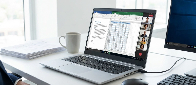 문서 작성, 엑셀, 웹 회의 등 사무 환경에서 노트북이 안정적으로 사용되는 장면을 표현한 이미지