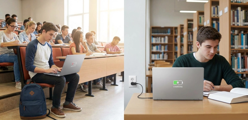 강의실과 도서관을 오가며 노트북을 사용하는 학생 환경을 보여주는 이미지