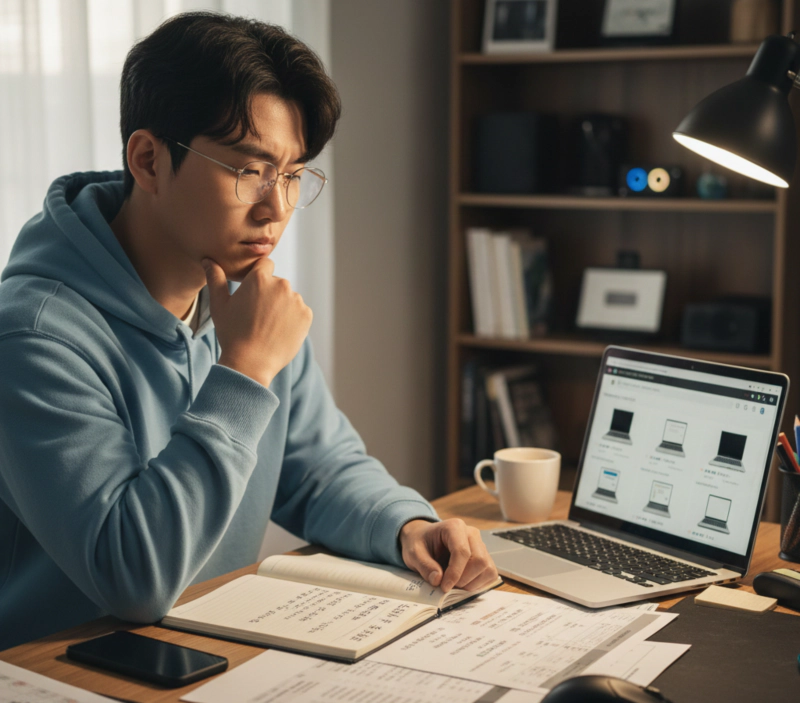 노트북 구매 전 자신의 사용 목적을 고민하며 선택 기준을 정리하는 장면을 표현한 이미지