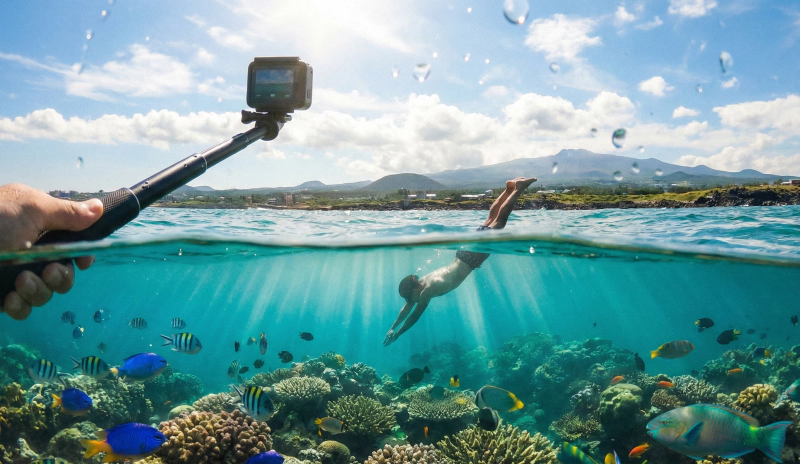 액션캠으로 촬영한 수중 다이빙 반수면 샷