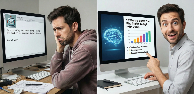 단순한 프롬프트로 생성된 기계적인 글과 프롬프트 엔지니어링을 통해 완성된 전문가 수준의 글 퀄리티 비교