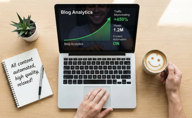 프롬프트 엔지니어링을 통해 고품질 글쓰기를 자동화하여 트래픽 상승과 여유를 모두 얻은 수익형 블로거의 모습