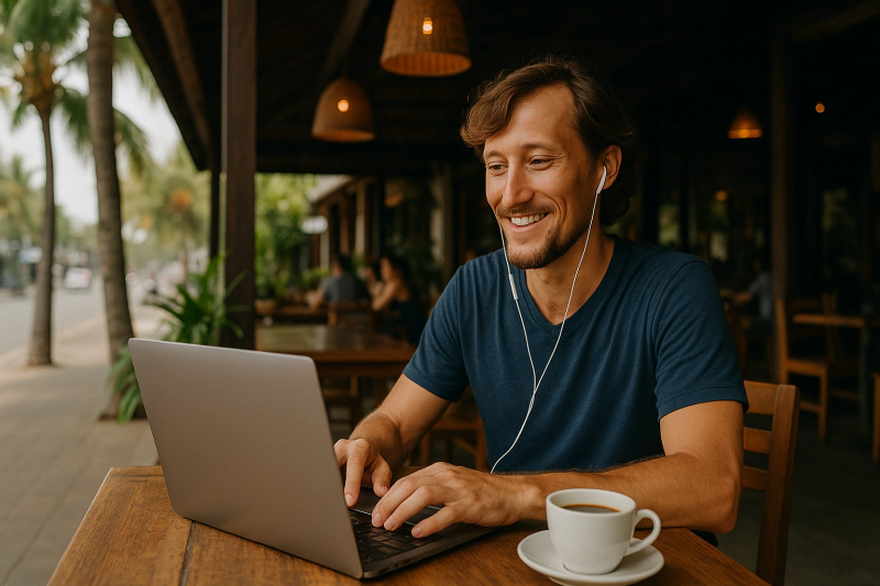 해외 카페에서 노트북으로 일하는 디지털 노마드 장면