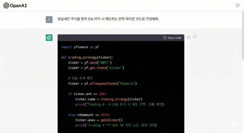 이렇게 입력하면, 챗GPT가 10초 만에 완벽한 파이썬 코드를 뱉어냅니다. 여러분은 그걸 복사해서 VS Code에 붙여넣기만 하면 됩니다.