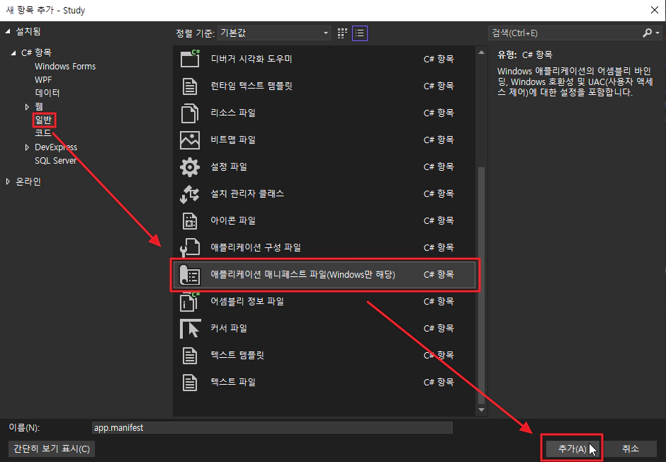 1. 비주얼 스튜디오 솔루션 탐색기에서 프로젝트 우클릭 -> [추가] -> [새 항목] -> [애플리케이션 매니페스트 파일(app.manifest)]을 추가합니다.