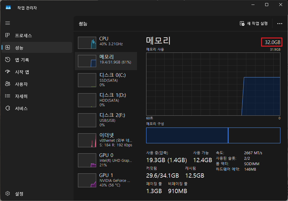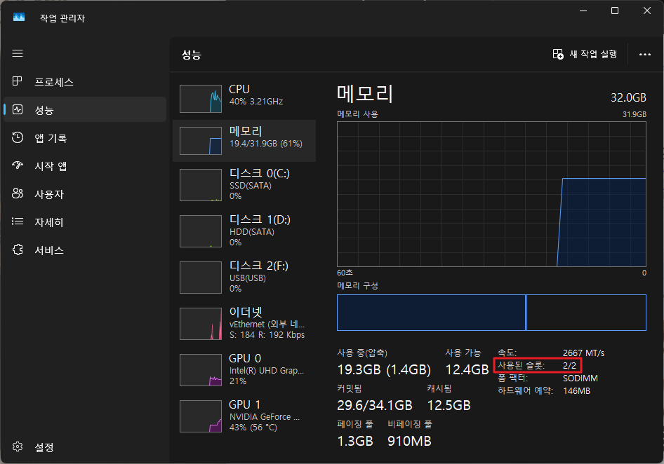 - 결과: 여기서 전체 용량뿐만 아니라 현재 사용량, 속도(MHz), 사용된 슬롯 수까지 한눈에 볼 수 있습니다.