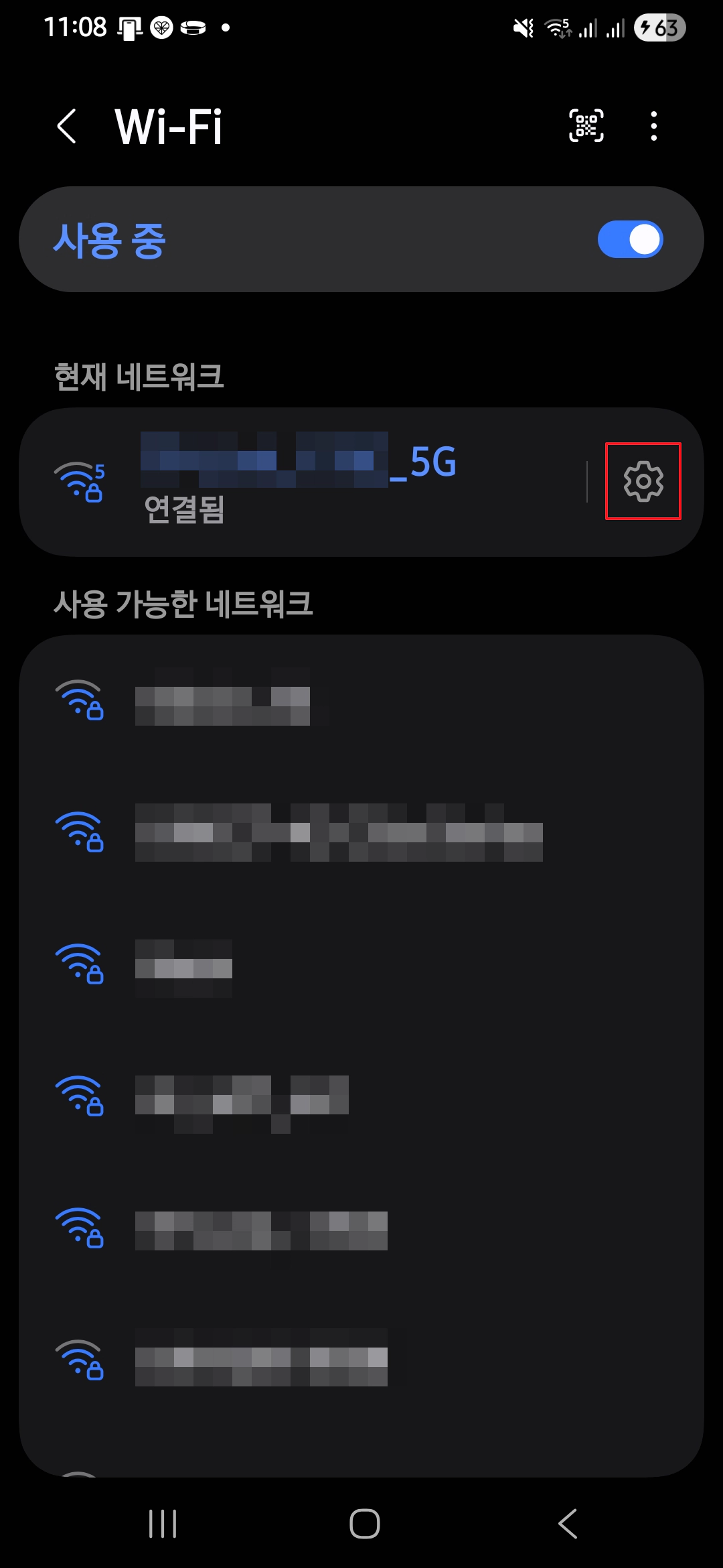 • 방법: 현재 연결된 와이파이 이름 옆의 [설정(톱니바퀴)] 아이콘을 누릅니다.