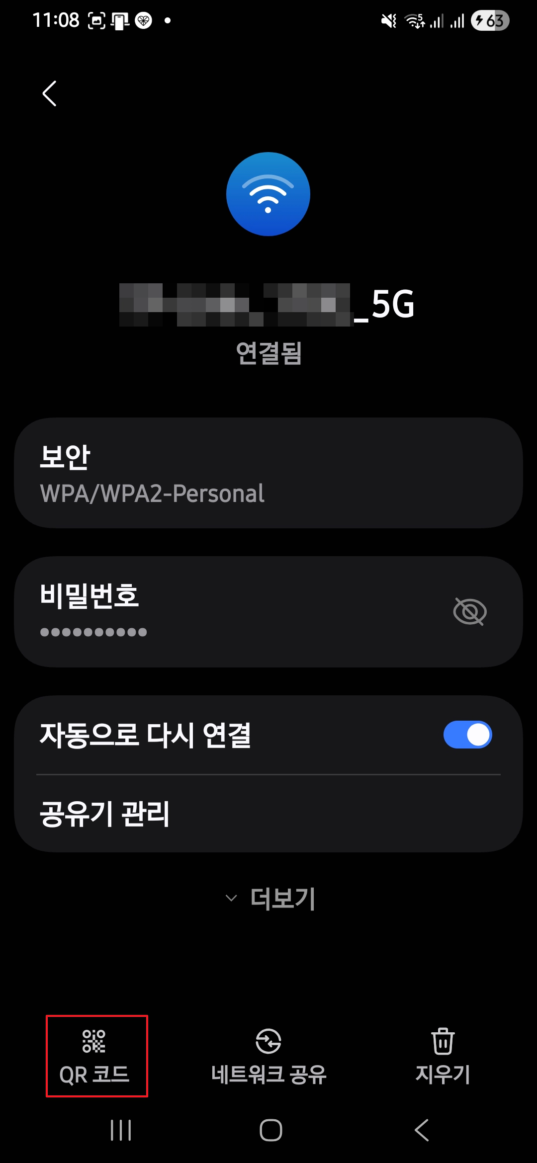 와이파이 설정 하단의 QR코드 버튼을 누르면 즉시 공유용 코드가 생성됩니다. (빨간색 네모칸 참고)