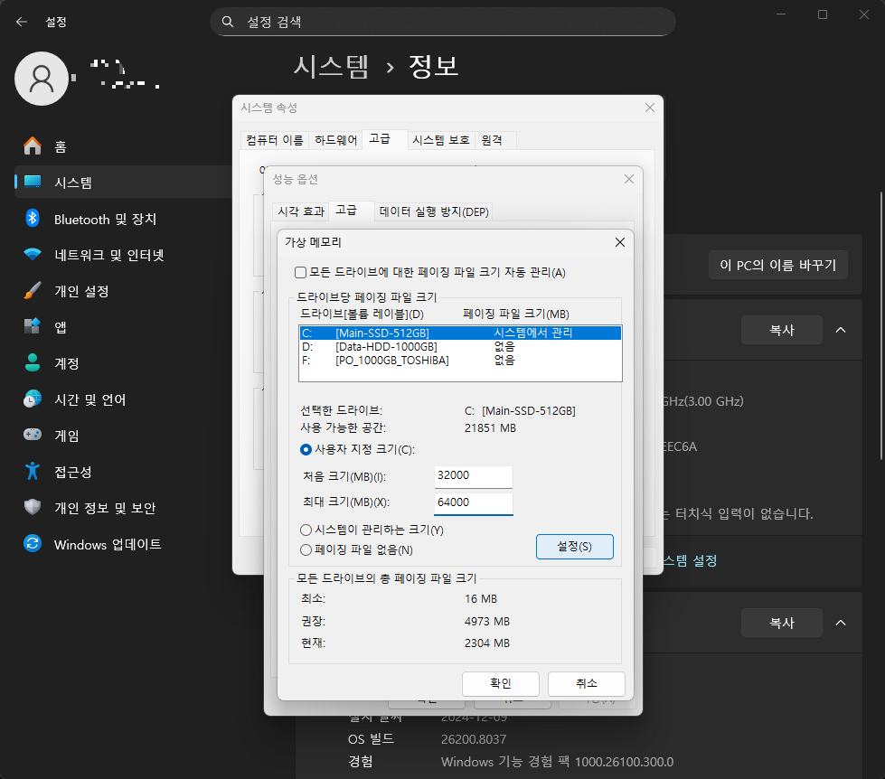 - 설정 방법: [내 PC 우클릭] > [속성] > [고급 시스템 설정] > [성능-설정] > [고급] 탭에서 가상 메모리를 수동으로 설정합니다.